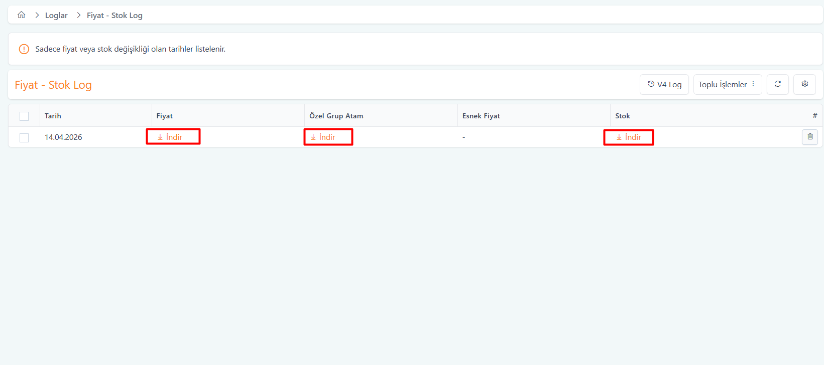 | Stok | İlgili tarihte stok değişikliği olan ürünlerin loglarını bu sütundan indirebilirsiniz. |